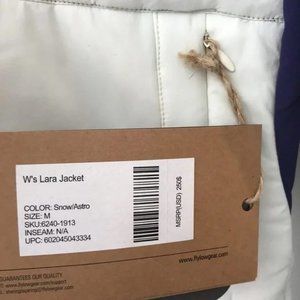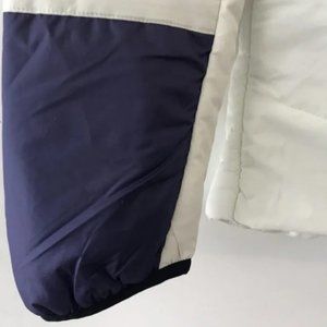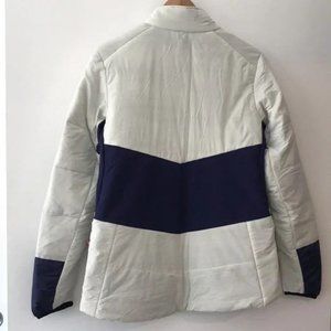 Insulated ski/snowboard jacket. White with purple accents. Warm jacket with flattering fit.