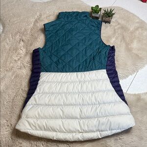 Gently used in good condition womens Flylow Laurel vest in size extra small. Color is called spruce / snow / Astro and is tealish green, bluish purple and off white. Ultralight fabric. 600 fill power down. Wind and water resistant. 3 zipped pockets. Great on its own or as a layering piece. Flattering mix of baffles and quilt. Please look at pictures for more details and let me know if you have any questions. Photos are a part of item description! Thanks!
