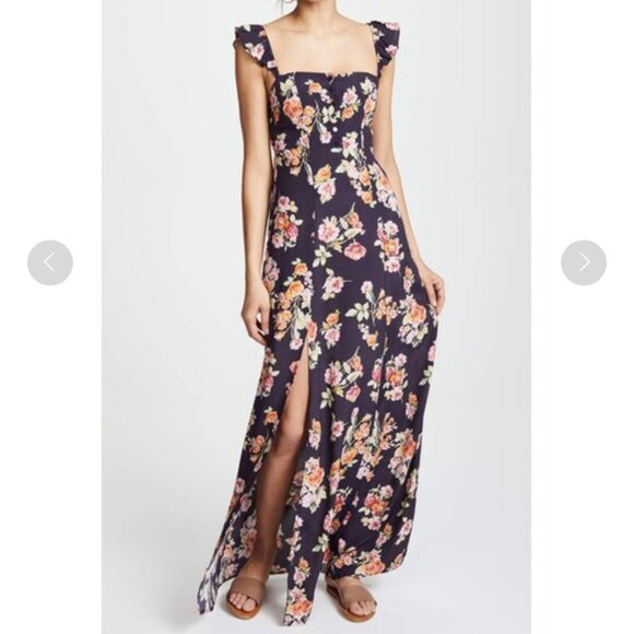 With ruffle straps that can be worn off-shoulder and a thigh-high slit, this Flynn Skye maxi dress is the head-turning style your summer needs. Beautiful navy dress with floral print, so comfortable and flattering. In excellent condition, only worn a few times. Originally $198.