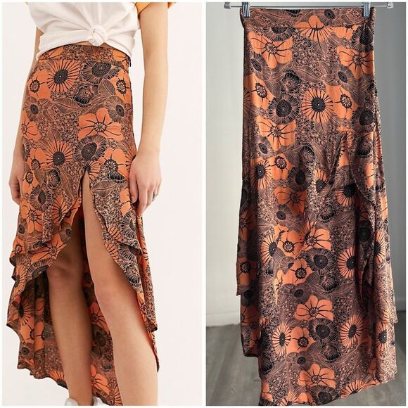 Flynn Skye maxi skirt in a bold orange and black floral print. Features a flattering high waist, flowy silhouette, and a high low hem with a front slit for easy movement. Side zipper closure. Lightweight fabric with a soft drape. Made in the USA. Perfect for summer, vacation, festivals, or dressed up with heels.