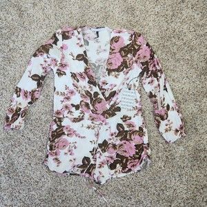 100% rayon. Surplice neckline. Drawstring waist. Ruched sides. DAMN GINA.