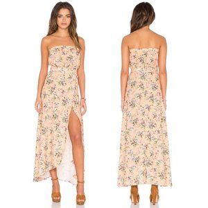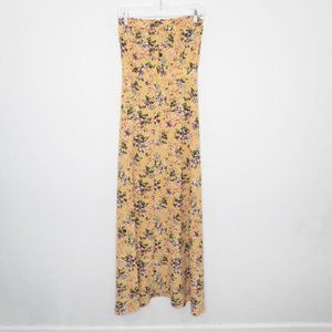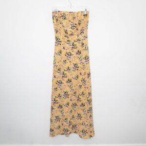 Dress from Flynn Skye in Squash Blossom. Strapless boho maxi dress in an peachy yellow orange with pink floral print. Elasticized bandeau top with fitted waist that flares out into a faux wrap skirt. Cute keyhole detail at back above zipper. Size Small.
