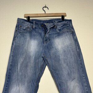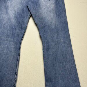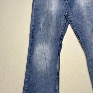 Men’s 36x30 blue denim jeans with bootcut fit, western style, and indie streetwear design
