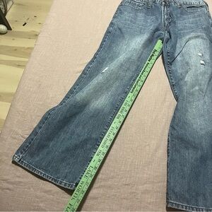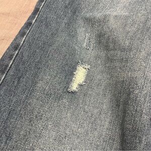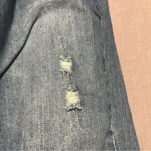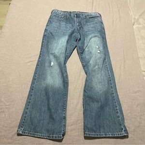 Comfortable relaxed fit. Classic blue denim. Distressed details.