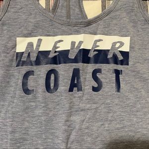 Solfire Designed in Brooklyn Flywheel Sports (known for Spin/Barre) Never Coast “Jessica” style Work Out Fitness Tank Top in Grey with Navy and White Lettering