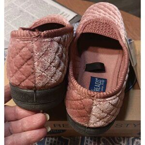 These Foamtreads Waltz slippers are in size 5W and are a cozy dusty rose color. They feature a quilted cotton velour brushed upper with a soft nylon tricot lining for comfort. The slip-on style has a round toe shape and a flat rubber outsole. These slippers are designed for women, offering cushioned support and a colorful theme. Perfect for relaxing at home in style.