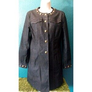 Focus 2000 Denim Jacket Long Dark Wash Square Stud Leopard Print Lined 6 Petite