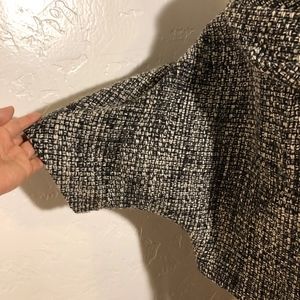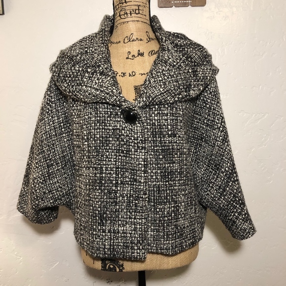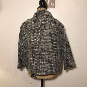 Gorgeous, Focus 2000 Vintage, cropped jacket, dolman sleeves, black and white in color, long fold over collar, size 12. Bust-armpit to armpit 56 inches, shoulder to shoulder 24 inches, length 23 inches.
