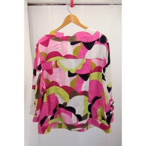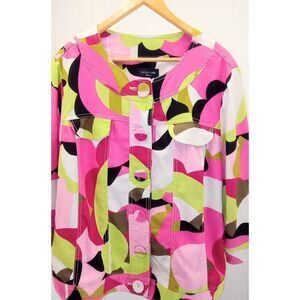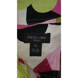 Pre-owned focus 2000,100% linen button front jacket. Long sleeves with three button detail, colors are shades of pink lime green black and cream. Very well made jacket. Not lined. Summer vibes.