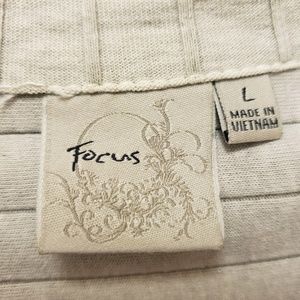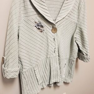 This blazer was bought at a craft show, and is like new. It is a light cream color and has a single small design on the front upper right part of the blazer, which was made by a crafter. It has three buttons going down the middle and also has two lower front pockets.
