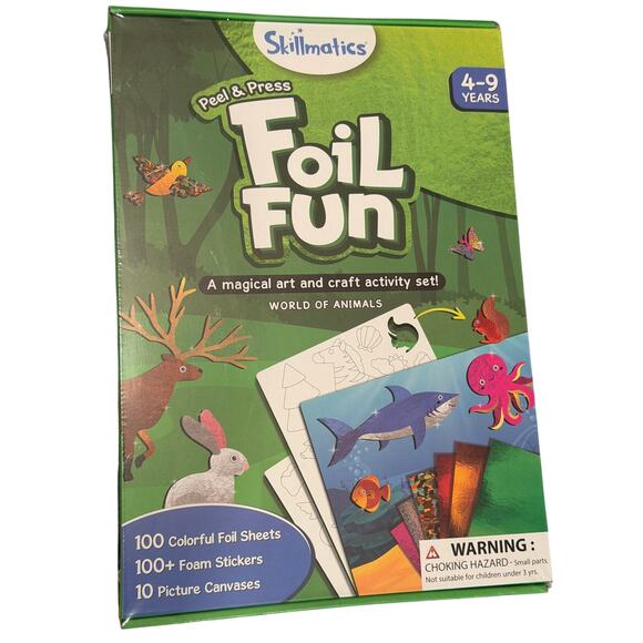 New sealed Skillmatics Foil Fun World of Animals art and craft activity set featuring peel-and-press foil designs that build creativity, fine motor skills, and hands-on play for kids ages 4–9.