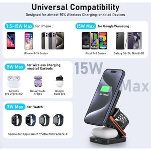 The Foldable 3-in-1 Magnetic Wireless Charging Station in Black is a versatile accessory compatible with a universal range of devices. It features a USB Type C main power connector and is Qi-certified for wireless charging. With a total of 1 USB port, this charging station is convenient and efficient for powering up your devices. The foldable design adds portability, and it comes with a carrying case for easy transport. Perfect for charging your smartwatch, phone, or other compatible devices on-the-go.