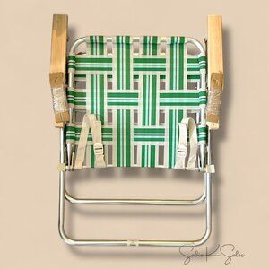 Folding Lawn Chair – Cream, Green & Light Blue Webbing with Wooden Armrests