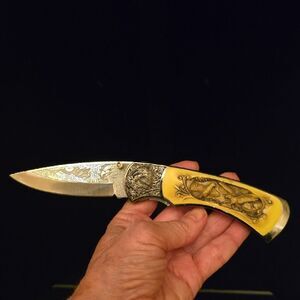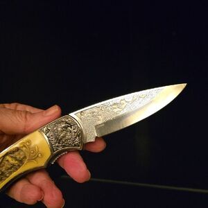 Folding Collectors KNIFE! Carving And Etchings On Handle And Blade. NWOT!
