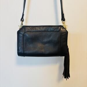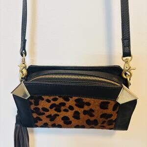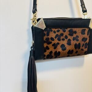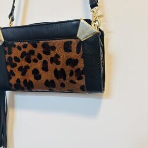 Foley + Corinna Crossbody Bag Womens Black Leopard Print Leather Tassel Purse