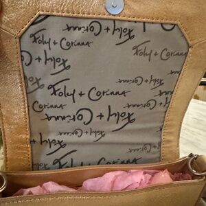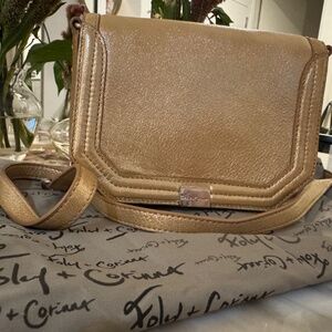 Perfect size gold purse with cross body strap and signature Foley & Corinna lining. Magnetic closure and adjustable shoulder strap. Used once for a wedding. In like new condition.