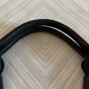 leather is intact. Some leather came off the bottom piping as pictured on 3 spots. Scratches on the hardware.