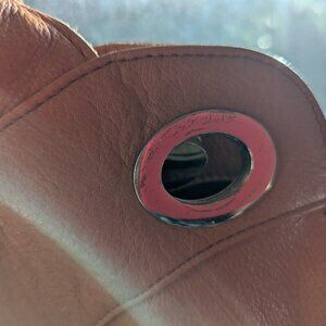 Foley+Corinna cognac/tan leather tote. Love the color, and it holds a lot. In good condition. Has a few marks on the leather, pictured, and metal hardware is scratched, also pictures. Inside is nearly spotless because it was only used a handful of times. Approx 15" w, 15" h, 5" d, 8" should drop.