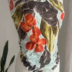 Chic and earthy vintage scarf styled as a top, featuring a neutral beige base with a bold blue and green leaf floral print. Lightweight and semi-sheer with a triangle cut, this versatile piece can be worn as a strapless top, hair wrap, neck scarf, or bag accessory. An understated yet stylish choice for minimalist wardrobes, nature lovers, or boho fashion fans.