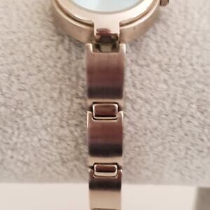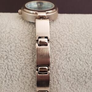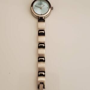 This folio women's watch is stainless steel with a 21mm case. Very good condition with only minor scratching on the bezel and band; crystal is scratch free. Currently running with a fresh battery.