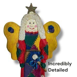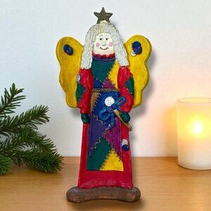 Artisan Folk Art Vintage Holiday Christmas angel figurine Polymer Clay hand painted patchwork dress wings a star on head 1990 Collectible