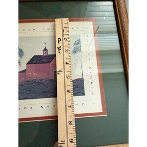 A charming vintage piece featuring W. Kimble's American Folk Art print, beautifully framed with an oak finish and green matte. Timeless decor accent. The Red Barn - A white Country Farm House - Americana