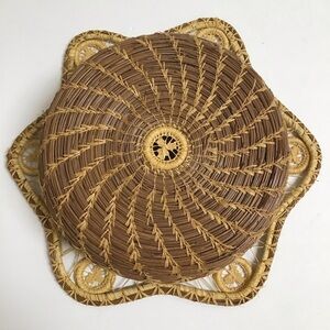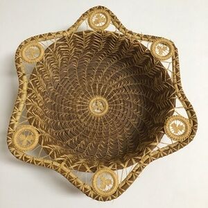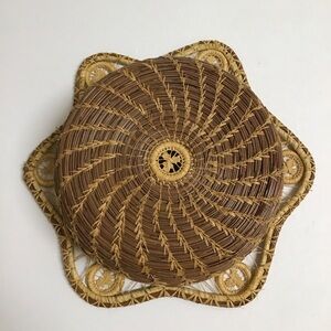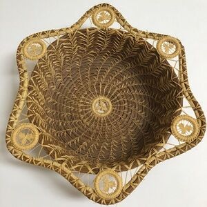 Absolutely beautiful hand-woven pine needle basket in a star shape. Very intricately made with a leaf motif in each of the point circles and the center.