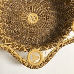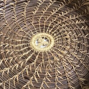 Interior weave resembles wheat stalks. A very stunning work of basketry art. Would be a lovely accent in a cabin, log home or rustic decor.