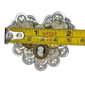 In a quaint Parisian atelier, a delicate brooch is crafted. Heart-shaped and adorned with mother-of-pearl buttons, this brooch whispers tales of romance and history. A miniature clock face hints at timeless moments, while an intricate cameo evokes nostalgia. Silk roses add an ethereal touch, making it an emblem of elegance.