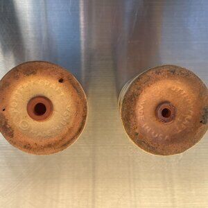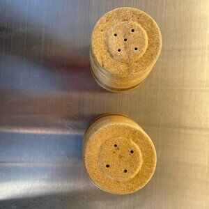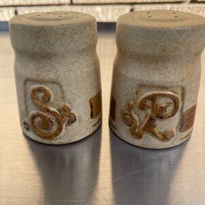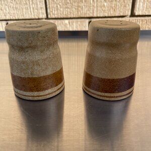 Beautiful Folk Art Pottery Craft USA Salt and Pepper Shakers. Excellent Condition. Sand colored ceramic, dark brown bands, handcrafted stoneware, 3.25 inches tall and diameter is 3.75 inches, excellent condition.