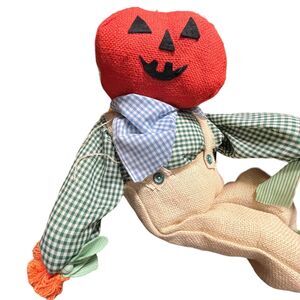 Folk Art Pumpkin Doll Jack O’Lantern Handmade Burlap Wire Gingham Primitive
