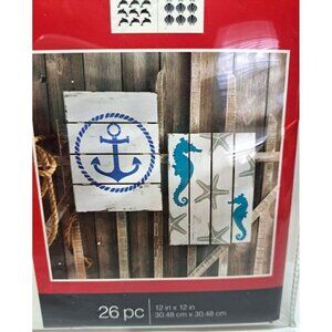 Stencil pack from Folk Art includes starfish, seahorse, sand dollar, sea turtle, octopus, crab, whale, and a variety of other nautical and beach themes.