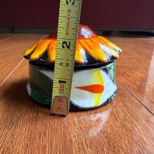 Folk Art Sun Ceramic Trinket Box Hand Painted Lid & Base Flower Yellow Black.