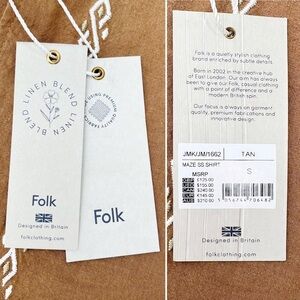Folk Men's Size Small Maze Short Sleeve Cotton Linen Shirt Button Up Tan New NWT