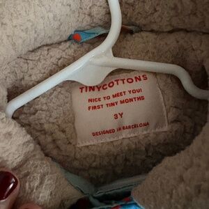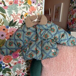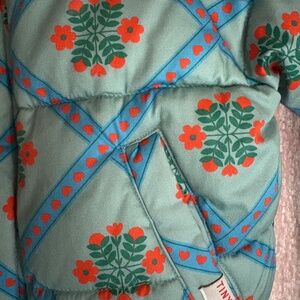 Super warm padded jacket with cotton folkore-inspired print exterior and cosy sherpa collar has full zip front with an additonal snap front.