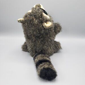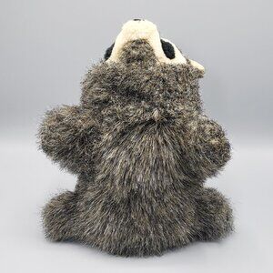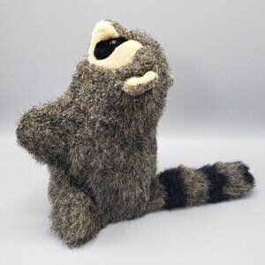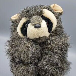 Folkmanis Puppets Baby Raccoon hand puppet with gray and black hair, and cream fur around the face. This animal toy could also be used as a head cover for golf clubs. It is made of polyester fiber and measures approximately 9" tall.