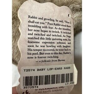 The Folkmanis Folktails Baby Lop Eared Rabbit Puppet Plush is a charming and adorable toy perfect for young children aged 3 and up. This puppet plush is part of the Folkmanis brand, known for its high-quality and realistic animal figures. With its baby bunny lop-eared rabbit design, this toy is sure to delight both boys and girls, making imaginative playtime a fun and engaging experience. Made in China, this puppet plush is a great addition to any preschooler's toy collection. Comes with original tags and book.
