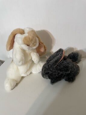 Two absolutely adorable bunny puppets. One is a super soft white and tan rabbit puppet in like new condition. About 11” high. The other is a precious dark gray bunny in great pre owned condition. About 7” long.