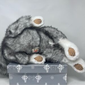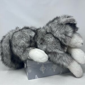 Soft and cuddly plush wolf toy. Features realistic gray and white fur. Perfect for kids and collectors.