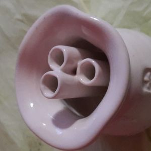 this is a Cream white Porcelain Vase It is sign on the bottom with the maker It has stamped on the front the symbol of Louisiana Fleurdelis!!! It has 3 round tubes circles in the Middle. wavy edge Around the top of the vase