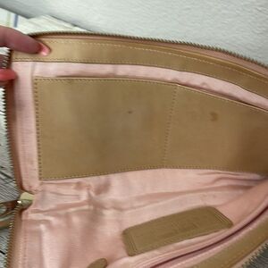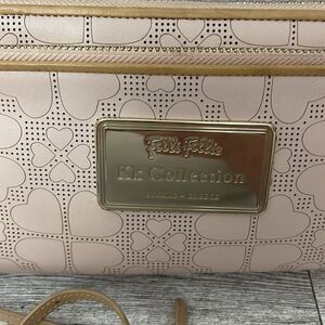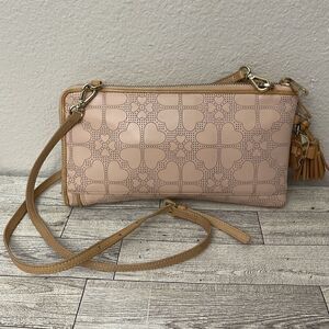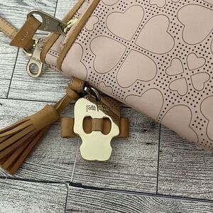 Folli Follie KK Collection Leather Crossbody. Blush Pink Leather with Tan Leather Trim. Made in Greece. Front exterior zippered pocket. Inside zippered pocket plus 2 slip pockets. Cute leather tassel and attached bag charm. Gold tone hardwares. Very Good Preloved Condition. Some minor signs of wear. See all photos. Detachable strap allows for conversion into a clutch. Measurements 10” x 5” with 21” adjustable strap drop.