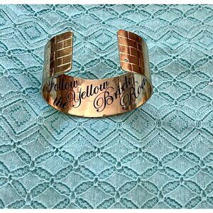 This exquisite cuff bracelet serves as a captivating accessory, meticulously crafted with a gold-tone brick design. It features an elegant engraving of "Follow the Yellow Brick Road," which adds an enchanting narrative to its aesthetic. The bracelet is ideally suited for wrists measuring 7 inches or smaller, making it a charming statement piece.