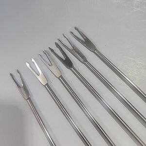 Set of 6 contemporary style long handled barbed serving forks. Use with a fondue set or your next celebration. Black plastic handles with colored insets so you can tell whose fork is whose.