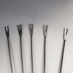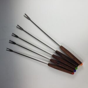 Set of 6 Mid-Century Modern long handled barbed serving forks. Use with a fondue set or your next celebration. Stainless steel with wood handles, likely teak and plastic colored insets so you can tell whose fork is whose.
