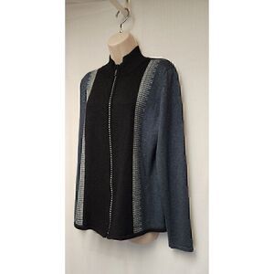 Fontana Black Ribbed Shimmer Jeweled Zip Up Sweater Size Medium