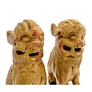 Foo Dog Figurine Pair Fu Lion Carved Wood Gold Gilt Asian Antique Oriental Decor
