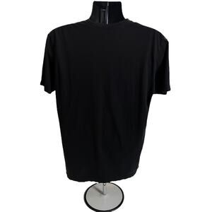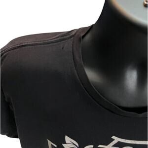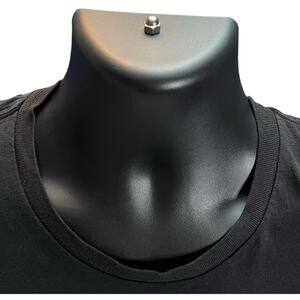 • Fading: The black fabric shows light fading, typical of a worn black T-shirt, especially near the edges and seams.