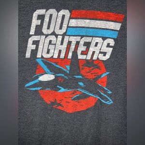 Gray t-shirt featuring a Foo Fighters graphic with red and blue accents.