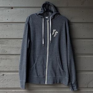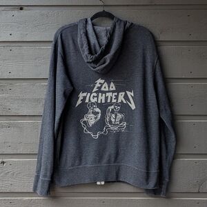 Great preowned condition Foo Fighters concert tour zip front hoodie sweatshirt. Charcoal gray with front and back design. FF on front. Foo Fighters spellout and 2 skeletons having a phone call on the back. Unisex. All tags have faded. Wash wear (pictured). No flaws.