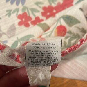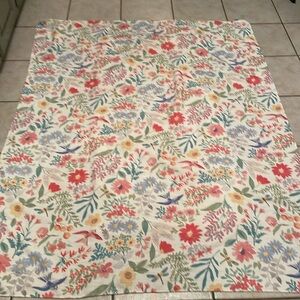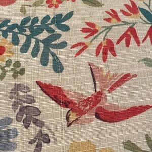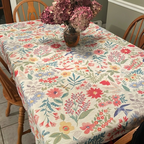 Food Network floral multi color tablecloth. Nice combination of birds, dragonflies, flowers snd greenery accent this tablecloth. Measured approx. 67” x 51 1/2”.